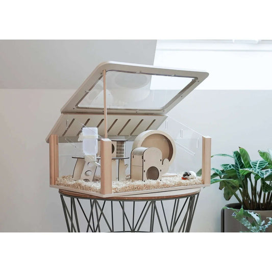 ROODZ Designer-Hamsterkäfig-Set – Moderner Käfig aus Holz und Acrylglas, inklusive umfangreichem Spiel- und Komfortzubehör