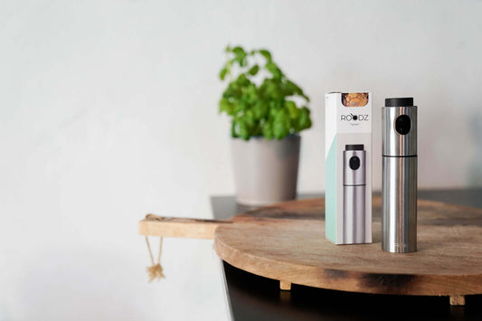 ROODZ Ölsprüher aus Edelstahl mit 100 ml Fassungsvermögen - Elegantes Design für Ihre moderne Küche: Stilvolles, präzises Dosieren leicht gemacht.
